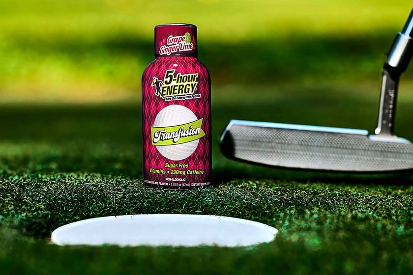 5-Hour Energy has released a flavor of its signature 5-Hour Energy Shot named Transfusion, pictured around gold clubs and balls in all of its promotional material, and the flavor itself is very much deeply rooted in the golfing community. For those not familiar with a Transfusion, no, we’re not talking about a blood transfusion; we mean the drink, the original classic golf cocktail Transfusion, featuring four key ingredients in vodka, ginger ale, grape juice, and for a splash of citrus, lime juice.
