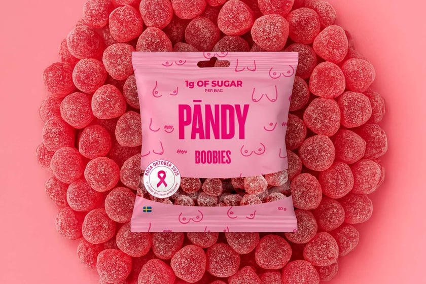 Here in 2025, Pandy has brought back its charitable Pandy Boobies gummy candy, again shaped appropriately and featuring a sweet strawberry flavor. Each bag has just 1g of sugar, 70 calories, and comes in a climate-friendly, to-go-sized package. For every bag sold, 2 SEK goes directly to the Swedish Bröstcancerförbundet, with bags of Pändy Boobies available through the Pandy website at 20 kr (2.13 USD) each or save 10% in a bundle of 14.